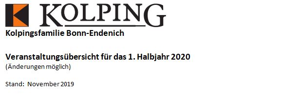 | 18.01.2020 (Sa) | Messe/Jahrgedächtnis für die Lebenden und Verstorbenen der Kolpingsfamilie, anschl. Gemütliches Beisammensein |