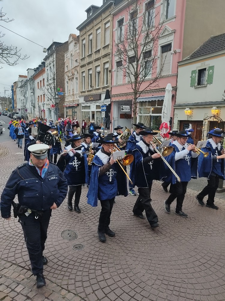Renate Torno zusammen mit ihren Vorstandskollegen das Bonner Prinzenpaar Prinz Christoph II. und Bonna Nadine I. auf der Endenicher ‚Rathaustreppe‘ vor der Fahrschule Schulterblick, den Prinzenführer Michael Cronenberg und die Equipe, Abordnungen der KG Narrenzunft und der KG Rot Schwarz sowie die Geschäftsführerin des DK Lustige Bucheckern, Marianne Haupt. Polizeihauptkommissar Dirk Prütz vom Endenicher Bezirksdienst sorgte für den reibungslosen Verlauf und die Musikerinnen und Musiker des Musikvereins Duisdorf begleiteten die Tour traditionell musikalisch.