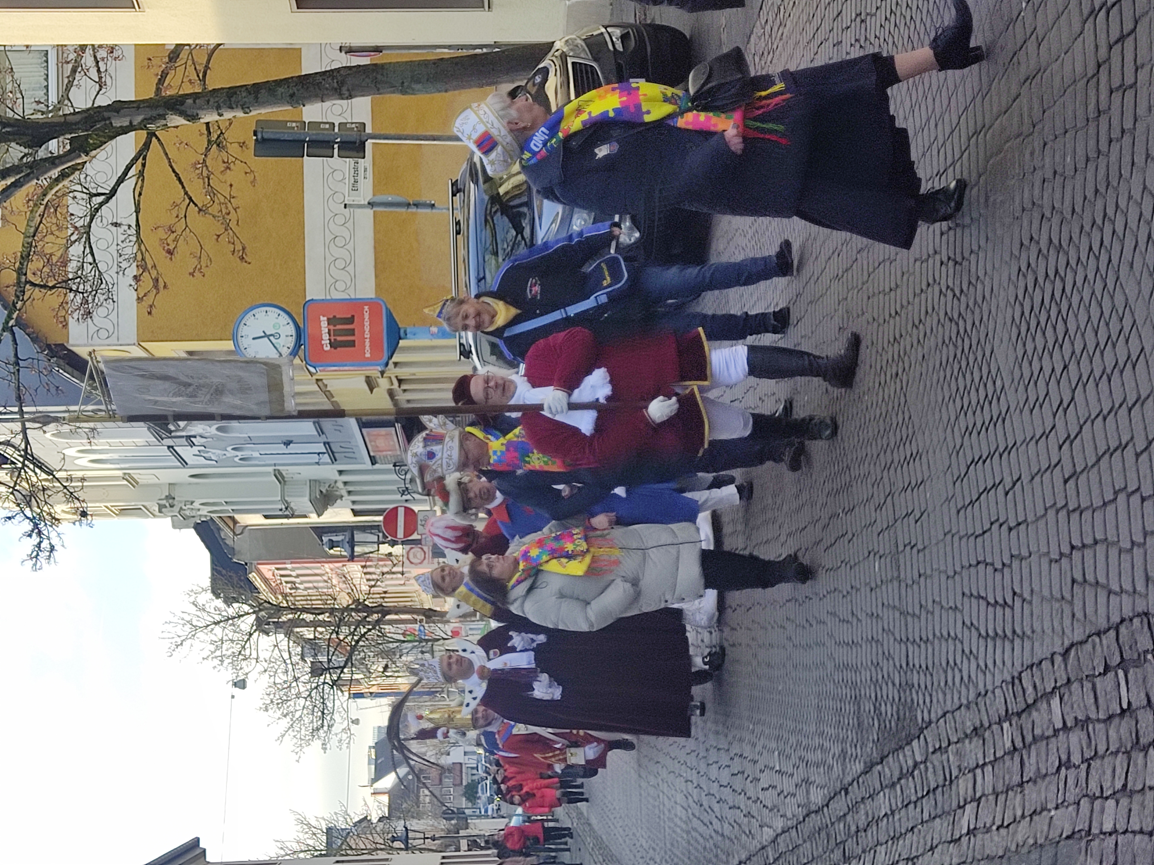 Am Samstag, d. 18.01.2025 begrüßte die stellvertretende Vorsitzende des Ortsausschusses Bonn-Endenich e.V., Claudia Manthey zusammen mit ihren Vorstandskollegen das Bonner Prinzenpaar Prinz Oliver I. und Bonna Maike I. auf der Endenicher ‚Rathaustreppe‘ vor der Fahrschule Schulterblick, den Prinzenführer Michael Cronenberg und die Equipe sowie eine große Abordnung der KG Rot Schwarz, die mit vielen Tänzerinnen und Tänzern ihrer Tanzgarde vertreten waren. Da die Bonna aus den Reihen der jungen Karnevalsgesellschaft Blau Blau Endenich 2020 e.V. kommt, schlossen sich etliche Mitglieder der KG unter Leitung des Vorsitzenden Dirk Faßbender-Schmitz der Shoppingtour an. Polizeihauptkommissar Dirk Prütz vom Endenicher Bezirksdienst sorgte für den reibungslosen Verlauf und die Musikerinnen und Musiker des Musikvereins Duisdorf begleiteten die Tour traditionell musikalisch.