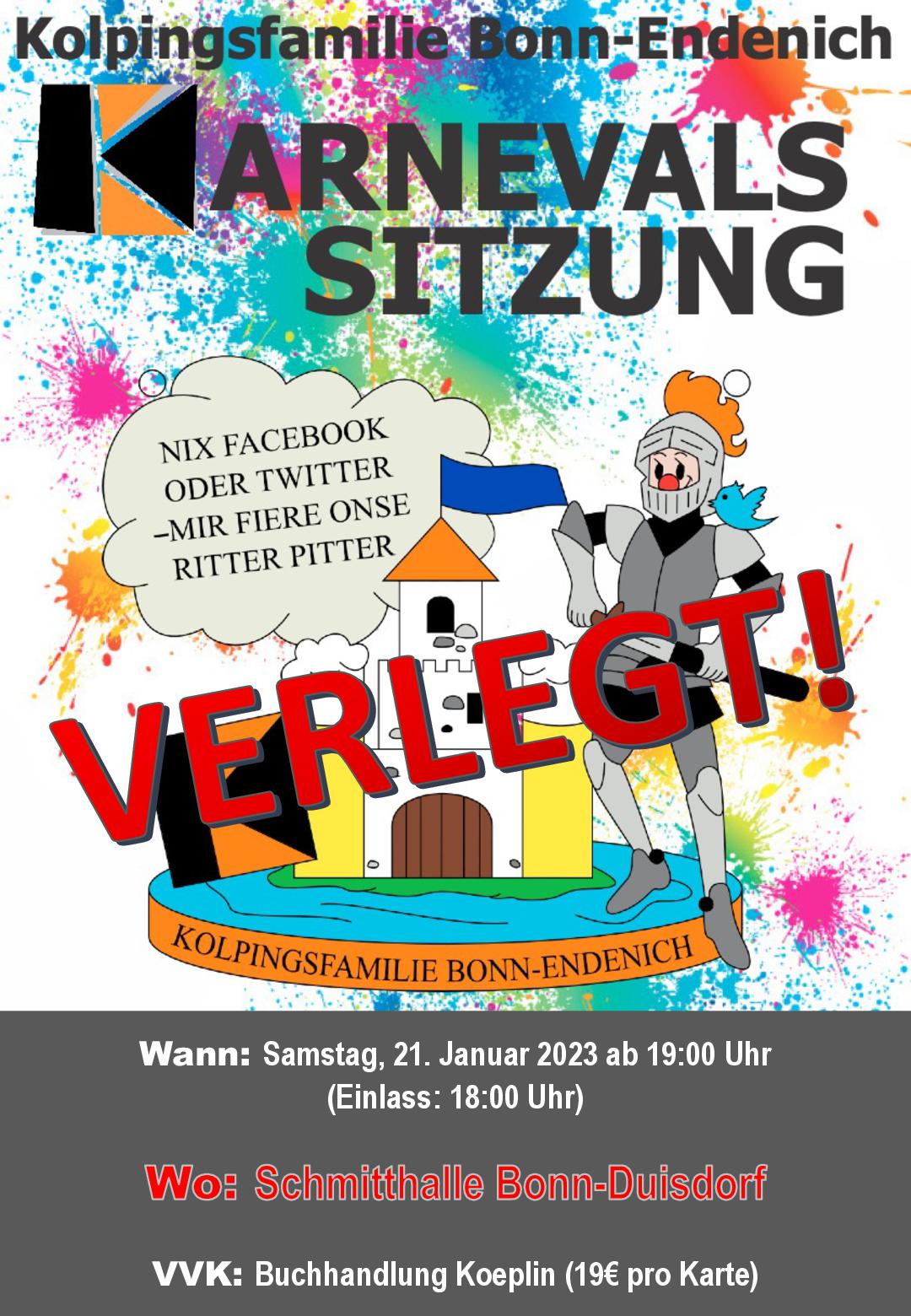 Nach drei langen Jahren ist es am Samstag, den 21.01.2023, wieder so weit. Leider müssen die frisch mit Prallschutz ausgestatten Türen der Josef-Strunck-Halle aufgrund eines Heizungsschadens geschlossen bleiben. Dafür findet die 68. Endenicher Kolpingsitzung in der Schmitthalle in Bonn Duisdorf (Schmittstraße 17, 53123 Bonn) statt. Unter dem Motto „Nix Facebook oder Twitter – mir fiere onse Ritter Pitter“ laden wir Sie ab 19 Uhr (Einlass: 18 Uhr) zu einer Zeitreise in den Karneval des Mittelalters ein.