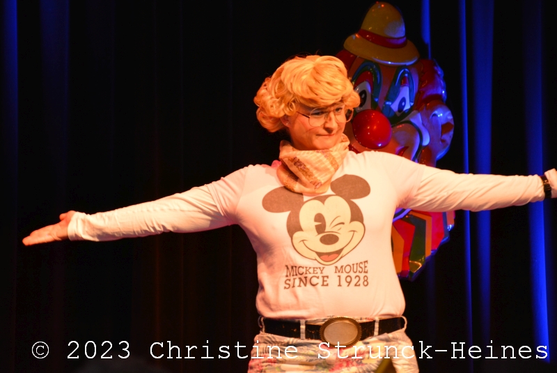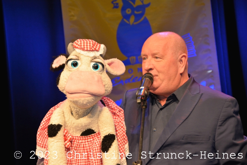 Großer Raum wurde wieder den Büttenrednern eingeräumt, eine Spezies, die im Party-Karneval oft arg kurz kommt. Zu Unrecht, denn sie sind es, die das Publikum durch Lachen erst so richtig in Stimmung bringen. Das gelang Bauchredner Peter Kerscher mit seiner Kuhpuppe „Dolly“ vorzüglich. Diese Kuh ist einfach nicht zu bremsen. Dolly, charmante und rotzfreche Partnerin von Peter Kerscher, bombardiert die Lachmuskeln Ihres Publikums mit einem Dauerfeuer an flotten und reichlich respektlosen Sprüchen.