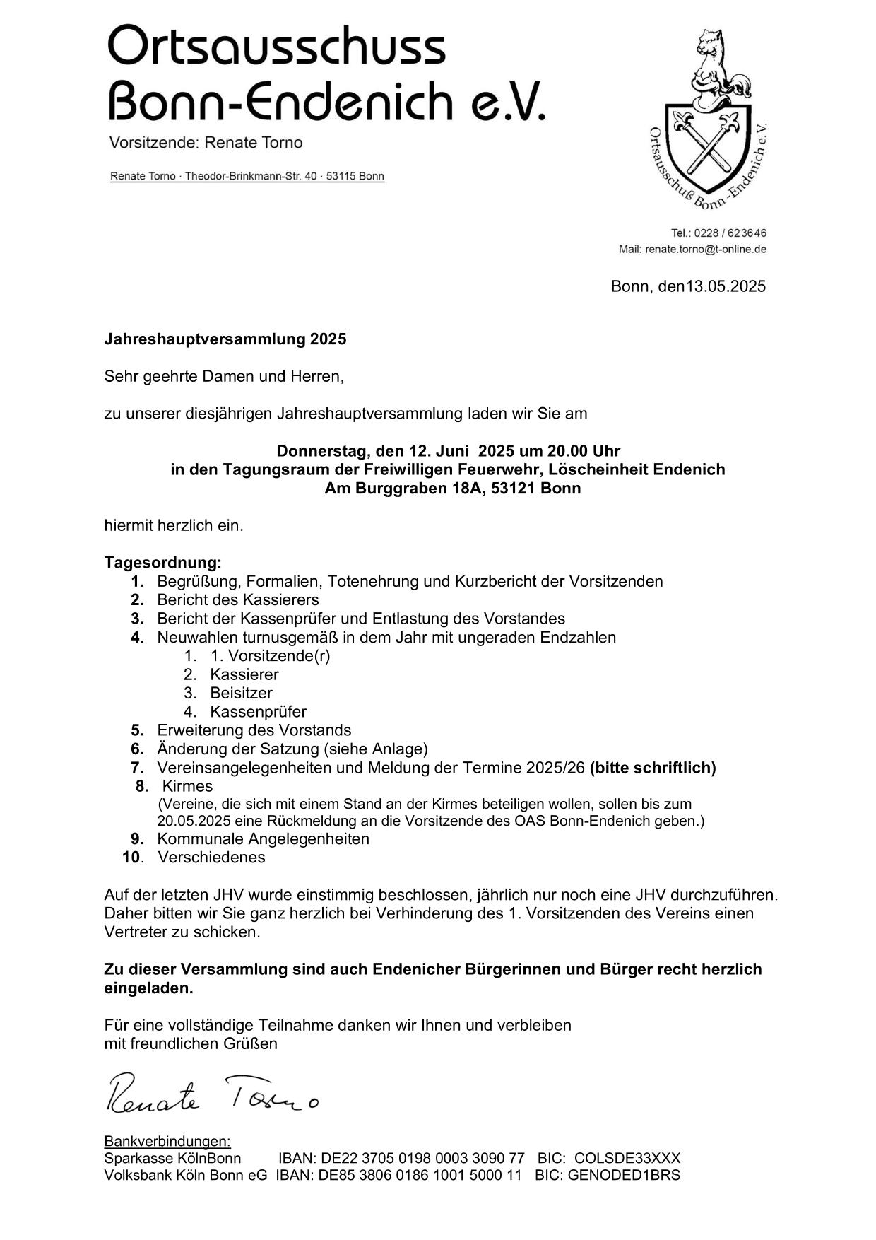 Renate Torno zur Ehrenvorsitzenden des Ortsausschusses Bonn-Endenich e.V. gewählt