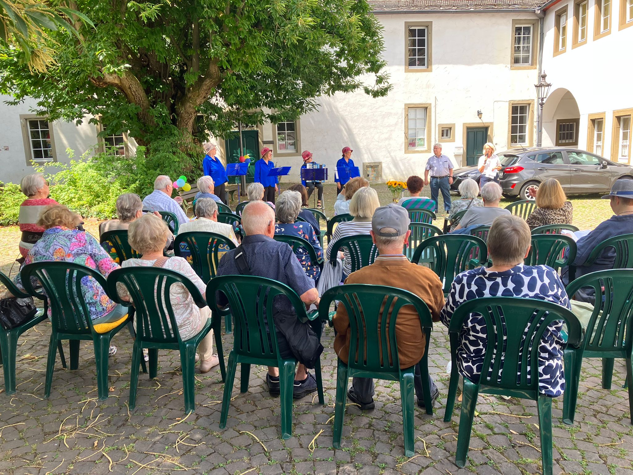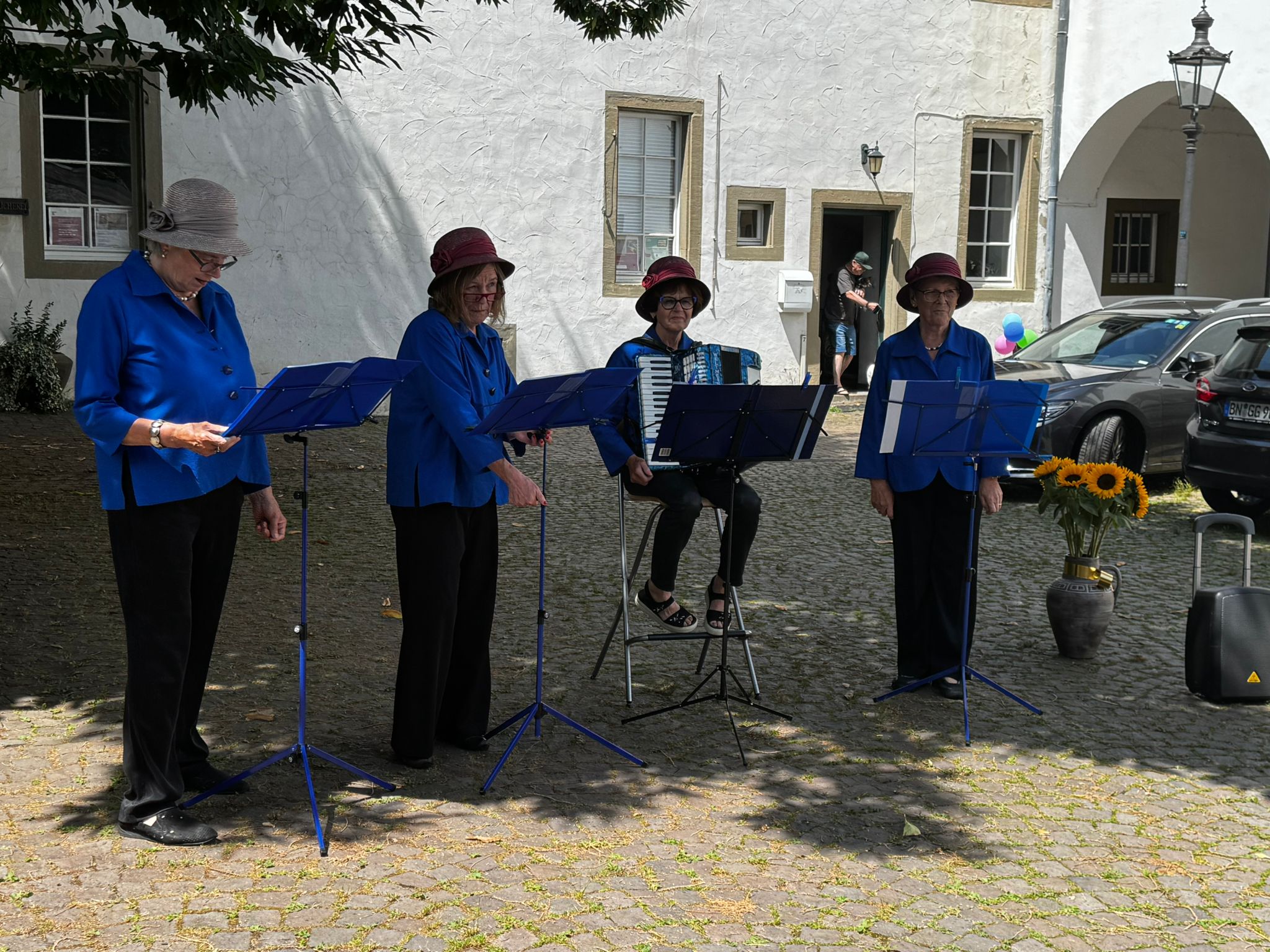 Für Freitag, den 27. Juni 2025 luden der Camilla-Bucherer-Fonds e.V. und die Städtische Begegnungsstätte Endenich zum 2. Gute Laune Singen mit den „Feschen Frolleins“ ein. Bei herrlichem Sommerwetter versammelten sich die Gäste um 14:00 Uhr im Innenhof der Endenicher Burg und nahmen auf den aufgestellten Stühlen ihre Plätze im Schatten der großen Esskastanie ein.